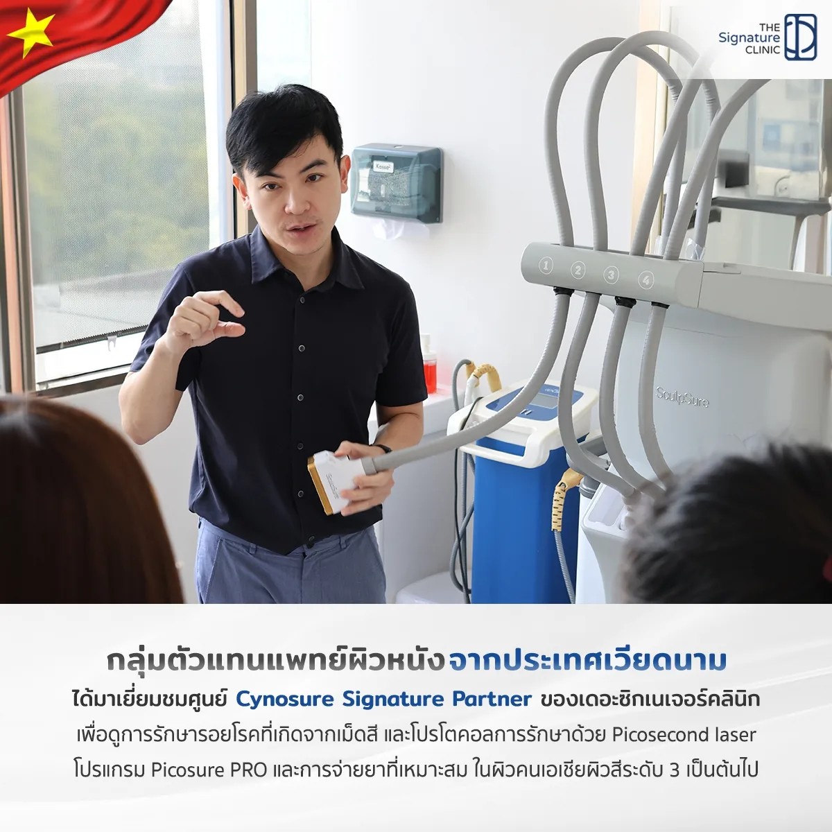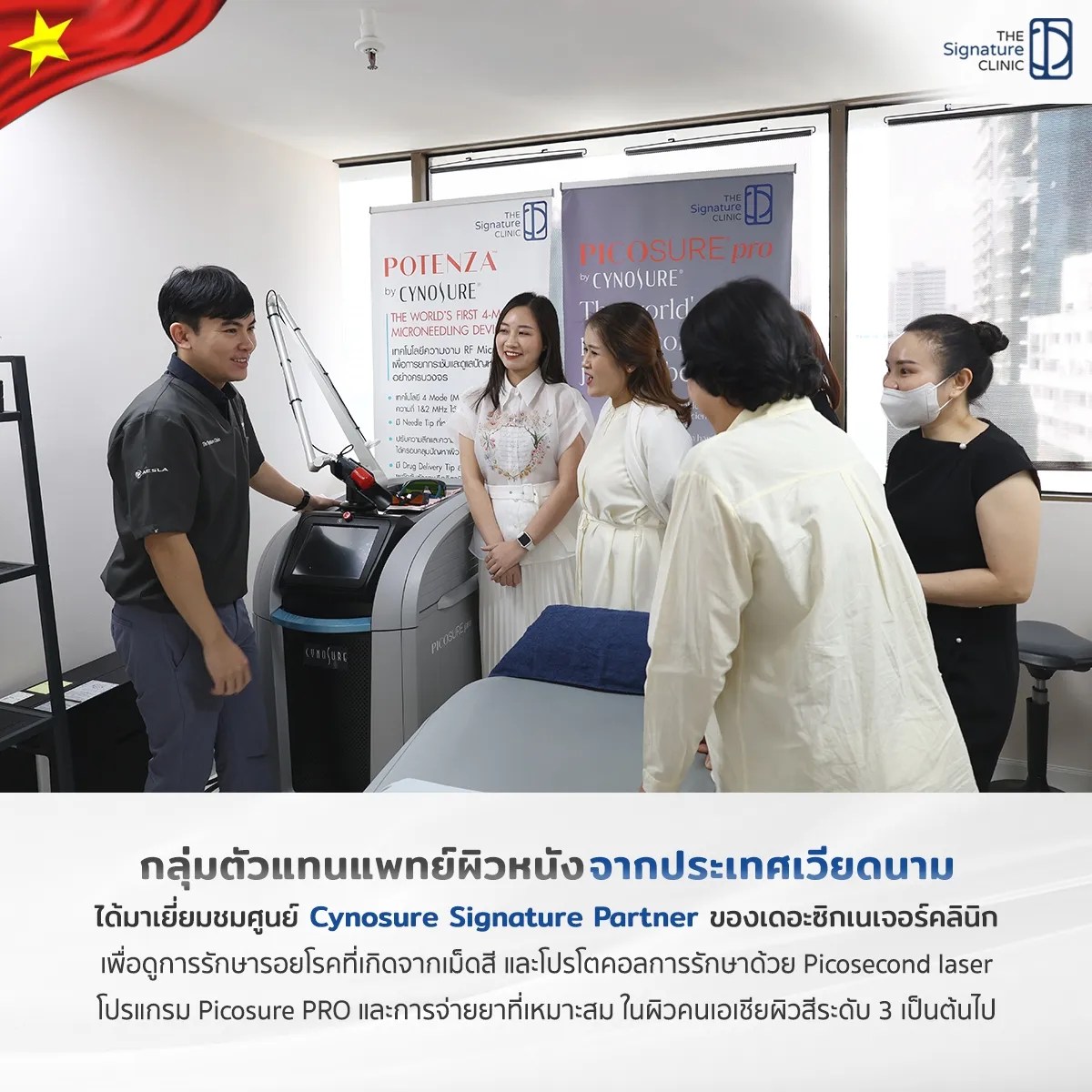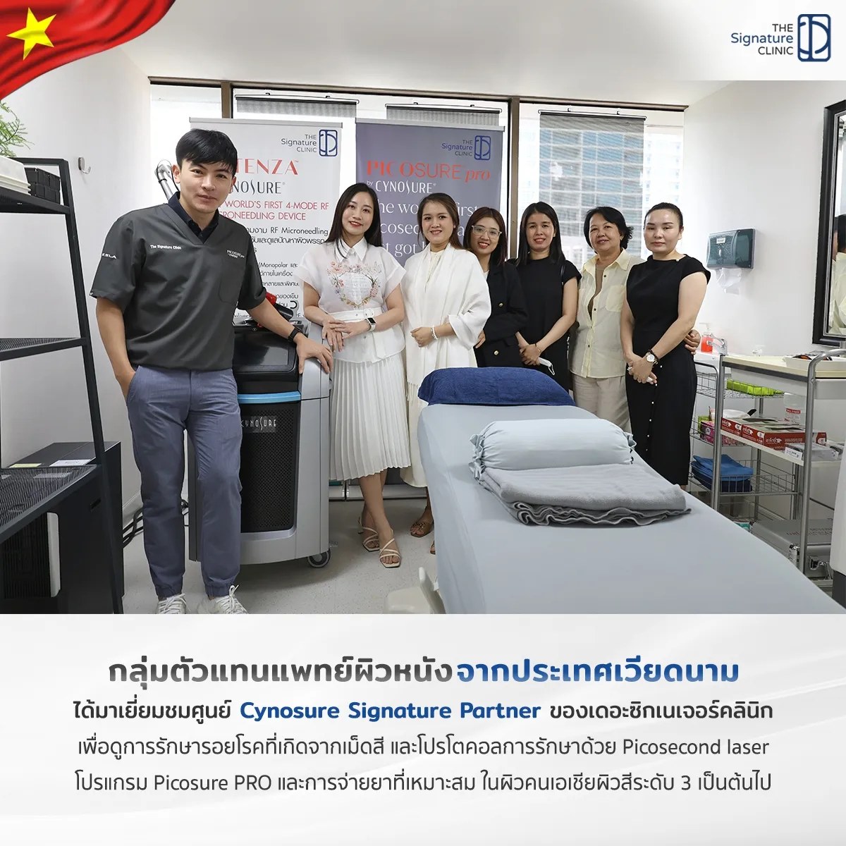 กลุ่มตัวแทนแพทย์ผิวหนังจากประเทศเวียดนามได้มาเยี่ยมชมศูนย์ Cynosure Signature Partner ของเดอะซิกเนเจอร์คลินิก เพื่อดูงานการรักษารอยโรคที่เกิดจากเม็ดสีและโปรโตคอลการรักษาด้วยเทคโนโลยี Picosecond laser โปรแกรม Picosure Pro และการจ่ายยาที่เหมาะสมในผิวคนเอเชียผิวสีระดับ 3 เป็นต้นไป