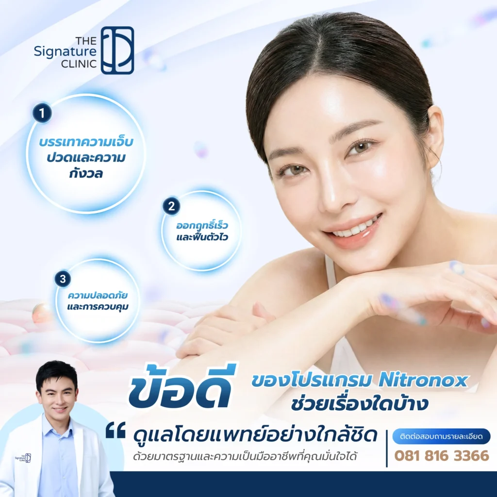 ความกังวลเรื่องความเจ็บปวดเป็นหนึ่งในอุปสรรคสำคัญที่ทำให้หลายท่านลังเลที่จะเข้ารับบริการดูแลผิวพรรณหรือปรับรูปหน้า ทาง The Signature Clinic จะพาไปทำความรู้จักกับ “โปรแกรม Nitronox” เทคโนโลยีทางการแพทย์ที่ออกแบบมาเพื่อบรรเทาความเจ็บปวดและลดความวิตกกังวลอย่างมีประสิทธิภาพ ช่วยให้การทำหัตถการเป็นเรื่องที่ผ่อนคลายและปลอดภัยยิ่งขึ้น พร้อมข้อมูลเจาะลึกที่ถูกต้องตามหลักวิชาการ เพื่อประกอบการตัดสินใจก่อนเข้ารับบริการ