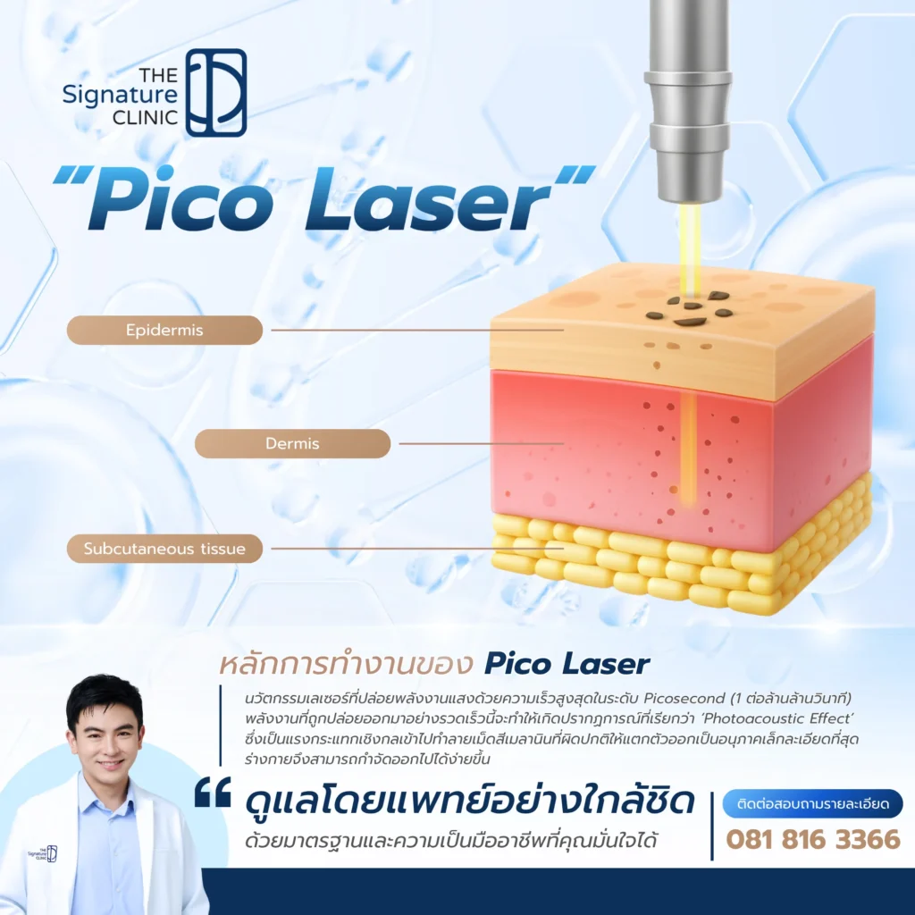 Pico Laser คือนวัตกรรมเลเซอร์ที่ปล่อยพลังงานแสงด้วยความเร็วสูงสุดในระดับ Picosecond (1 ต่อล้านล้านวินาที) พลังงานที่ถูกปล่อยออกมาอย่างรวดเร็วนี้จะทำให้เกิดปรากฏการณ์ที่เรียกว่า ‘Photoacoustic Effect’ ซึ่งเป็นแรงกระแทกเชิงกลเข้าไปทำลายเม็ดสีเมลานินที่ผิดปกติให้แตกตัวออกเป็นอนุภาคเล็กละเอียดที่สุด ร่างกายจึงสามารถกำจัดออกไปได้ง่ายขึ้น หลักการนี้ช่วยลดการสะสมความร้อนบนผิว ทำให้มีความเสี่ยงต่อผลข้างเคียงเช่นรอยไหม้ลดลงอย่างมากเมื่อเทียบกับเลเซอร์รุ่นเก่า