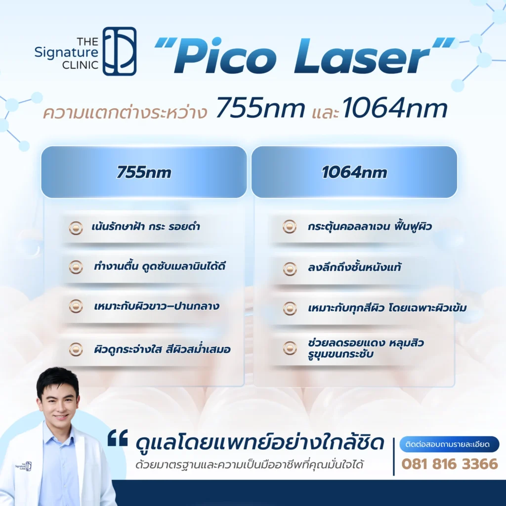 เคยสงสัยไหมว่าทำไมการรักษาด้วย Pico Laser ในแต่ละที่จึงให้ผลลัพธ์ที่แตกต่างกัน? หนึ่งในปัจจัยสำคัญคือ “ความยาวคลื่น” ที่เลือกใช้ ซึ่งโดยหลักแล้วจะแบ่งเป็น 755 นาโนเมตร (nm) และ 1064 นาโนเมตร (nm) บทความนี้จะเจาะลึกถึงความแตกต่างของ เลเซอร์ Pico ทั้งสองชนิด เพื่อให้คุณเข้าใจว่า Pico laser ช่วยอะไรได้บ้าง? และแบบไหนที่ตอบโจทย์ปัญหาผิวของคุณมากที่สุด ตั้งแต่ปัญหารอยดำ ฝ้า กระ ไปจนถึงหลุมสิว เพื่อให้คุณสามารถปรึกษาแพทย์และวางแผนการรักษาได้อย่างมั่นใจยิ่งขึ้นกับ เทคโนโลยี Picosure ที่ The Signature Clinic