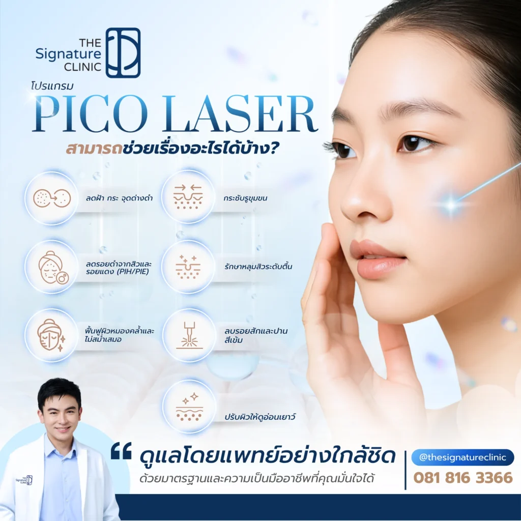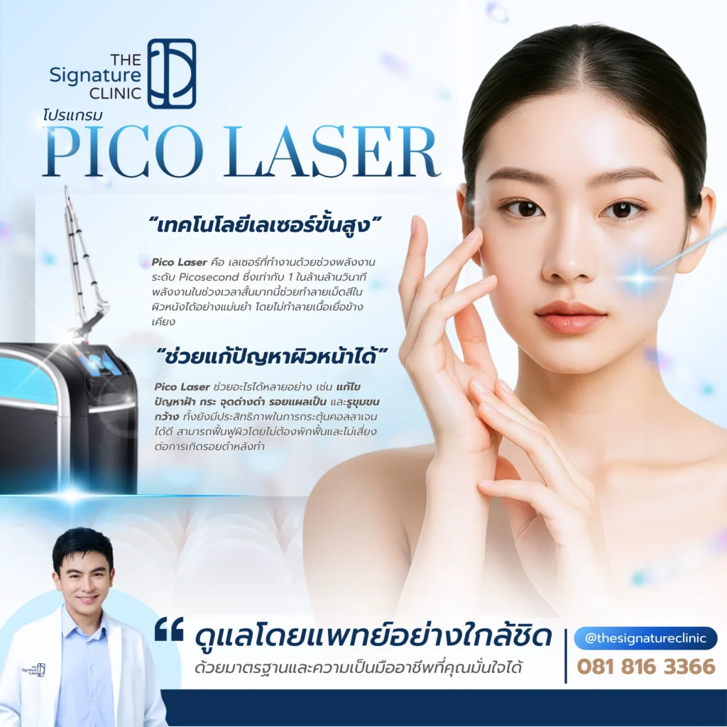 Pico Laser คือเทคโนโลยีเลเซอร์ที่ช่วยให้การดูแลผิวมีประสิทธิภาพมากยิ่งขึ้น ทั้งในด้านการลดเม็ดสี ฝ้า กระ จุดด่างดำ รอยแผลเป็น รอยสัก และการฟื้นฟูผิวโดยไม่ต้องพักฟื้นนาน ด้วยพลังงานแบบ Picosecond ที่ทำให้การยิงเลเซอร์มีความแม่นยำ ปลอดภัย และไม่ทำให้ผิวบางลง เมื่อทำร่วมกับแพทย์ผู้เชี่ยวชาญจาก The Signature Clinic ซึ่งมีเครื่องมือมาตรฐานระดับโลก และประสบการณ์สูงในการวางแผนการรักษาเฉพาะบุคคล จะทำให้คุณได้รับผลลัพธ์ที่คุ้มค่าและยั่งยืน ทั้งนี้ การประเมินปัญหาผิวก่อนเริ่มการรักษาถือเป็นกุญแจสำคัญสู่ความสำเร็จของการทำ Pico Laser อย่างแท้จริง