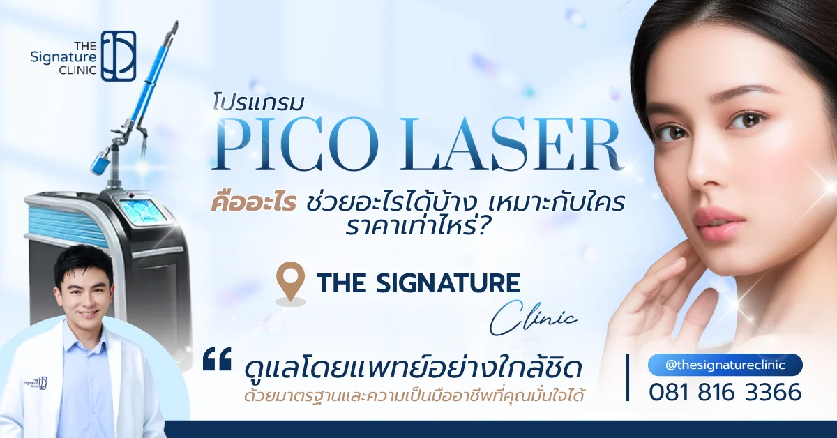 - The Signature Clinic คือคลินิกที่เชี่ยวชาญการรักษาด้วย Pico Laser โดยเฉพาะ ให้บริการด้วยเครื่องแท้ระดับโลก เช่น Picosure Pro พร้อมทีมแพทย์ผู้เชี่ยวชาญ และโปรแกรมดูแลหลังทำแบบเฉพาะบุคคล เพื่อให้ผลลัพธ์ออกมาปลอดภัยและมีประสิทธิภาพสูงสุด